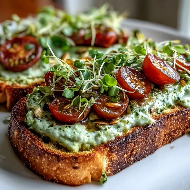 For the best flavor, make sure your avocado is perfectly ripe - it should yield slightly to gentle pressure. The pesto can be made a few hours ahead and stored with plastic wrap pressed directly on the surface to prevent browning, but the toast should be assembled just before serving for maximum crispness.