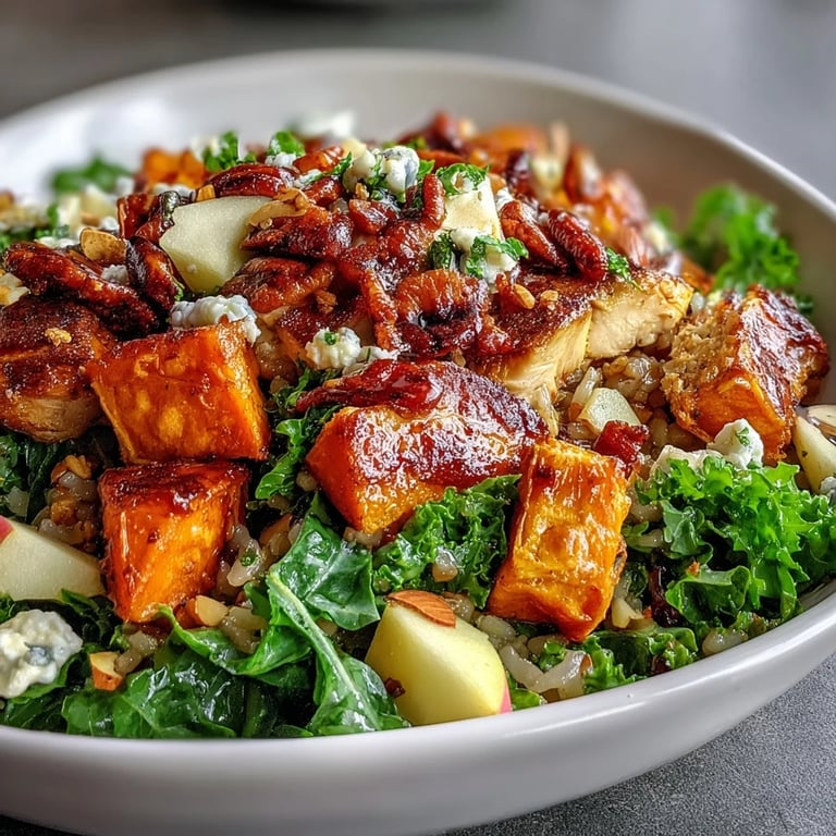 Pin It Embrace the vibrant flavors of autumn with this nourishing Harvest Bowl. This hearty dish brings together tender roasted chicken, sweet potatoes, and nutty wild rice on a bed of massaged kale. Topped with crisp apples, creamy goat cheese, and crunchy almonds, it is finished with a tangy homemade balsamic dressing for a meal that is as satisfying as it is beautiful.