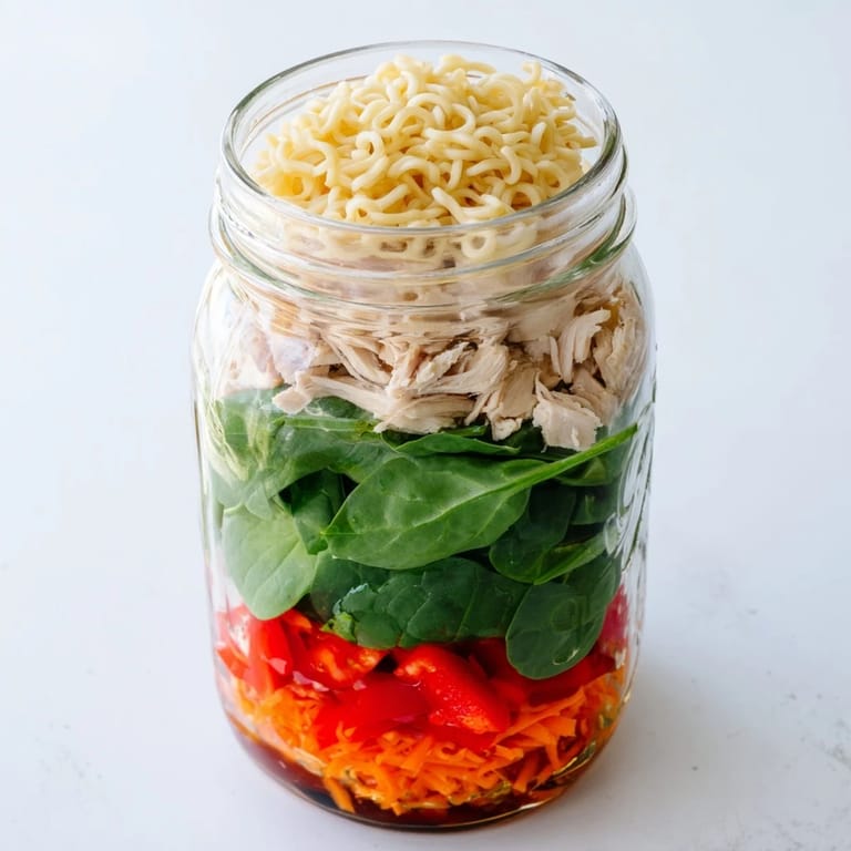 Start with the sauce at the bottom of the jar, followed by diced protein, then vegetables (carrots, peppers, spinach, scallions, bean sprouts), and finish with noodles on top. This layering prevents the noodles from becoming soggy.