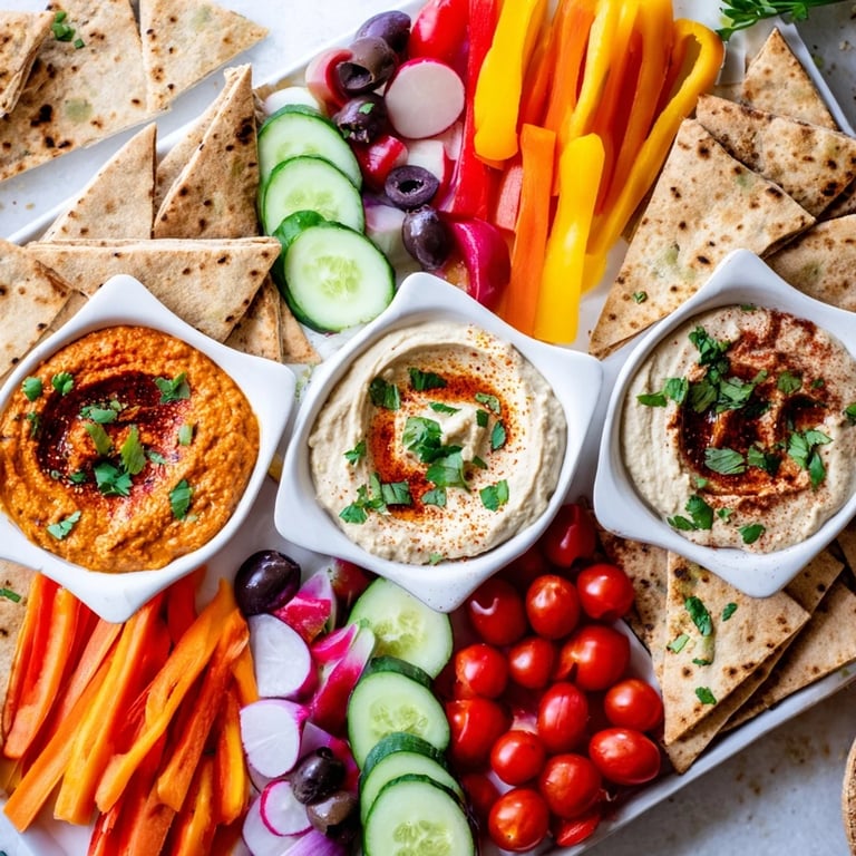 Hummus, roasted red pepper muhammara, and baba ganoush provide rich, spiced flavors that pair perfectly with the fresh vegetables and flatbreads.