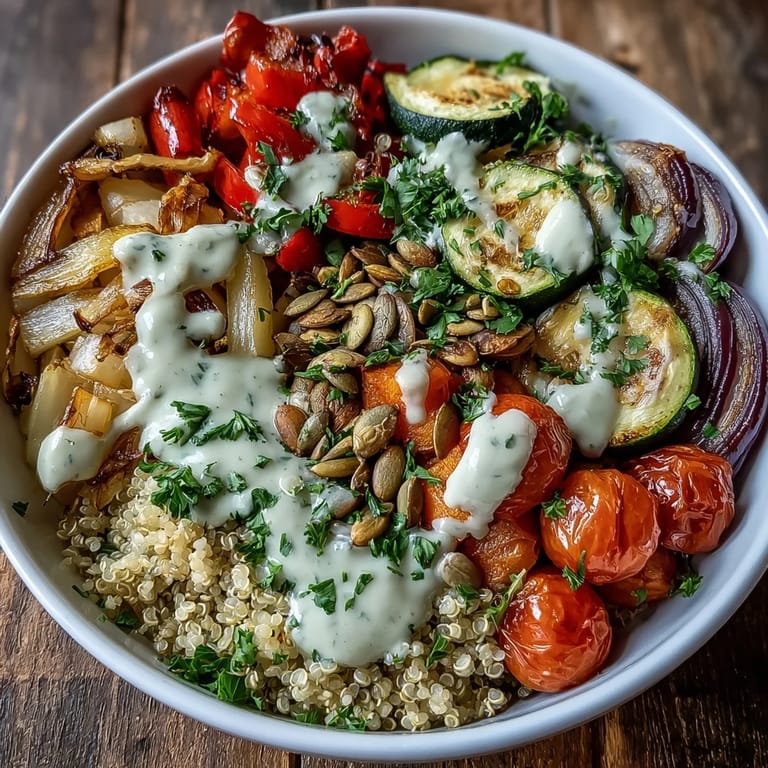 Pin It Experience a burst of vibrant colors and wholesome nutrition with this Roasted Vegetable Quinoa Bowl. This Mediterranean-inspired dish brings together tender zucchini, sweet cherry tomatoes, and red onions, all roasted to perfection and served over a bed of fluffy quinoa. Finished with a velvety tahini dressing, it is a satisfying meal that proves healthy eating can be truly delicious.