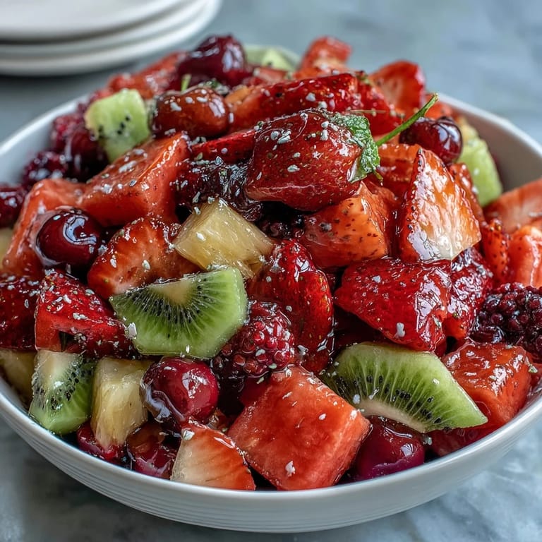 There's real wisdom in how unpretentious this salad is—it doesn't demand specialty ingredients or technique, yet it arrives looking intentional and tasting vibrant. The combination of fruit colors naturally creates a centerpiece that draws the eye without you having to do anything clever with plating. It's the kind of dish that feels equally at home at a casual backyard gathering or tucked into a more formal spread, which is exactly why I keep coming back to it.