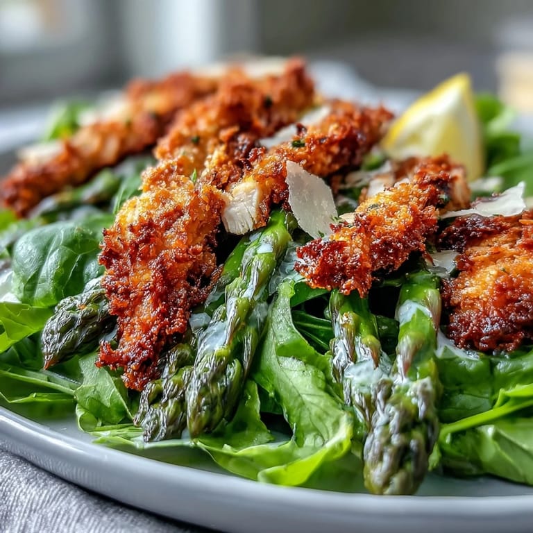 Pin It My neighbor stopped by one afternoon with a bag of asparagus from her garden, and I remember thinking, how many ways can you eat asparagus before it gets boring? That's when I decided to coat it in Parmesan and breadcrumbs, crisp it in the oven, and throw it on top of a simple salad with shredded chicken. The moment I bit into that golden-crusted spear over cool greens, I understood why she grows so much of it. Now this salad shows up on my table whenever I need something that feels both indulgent and light.